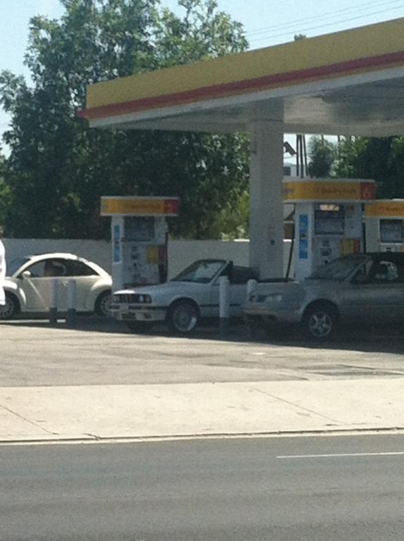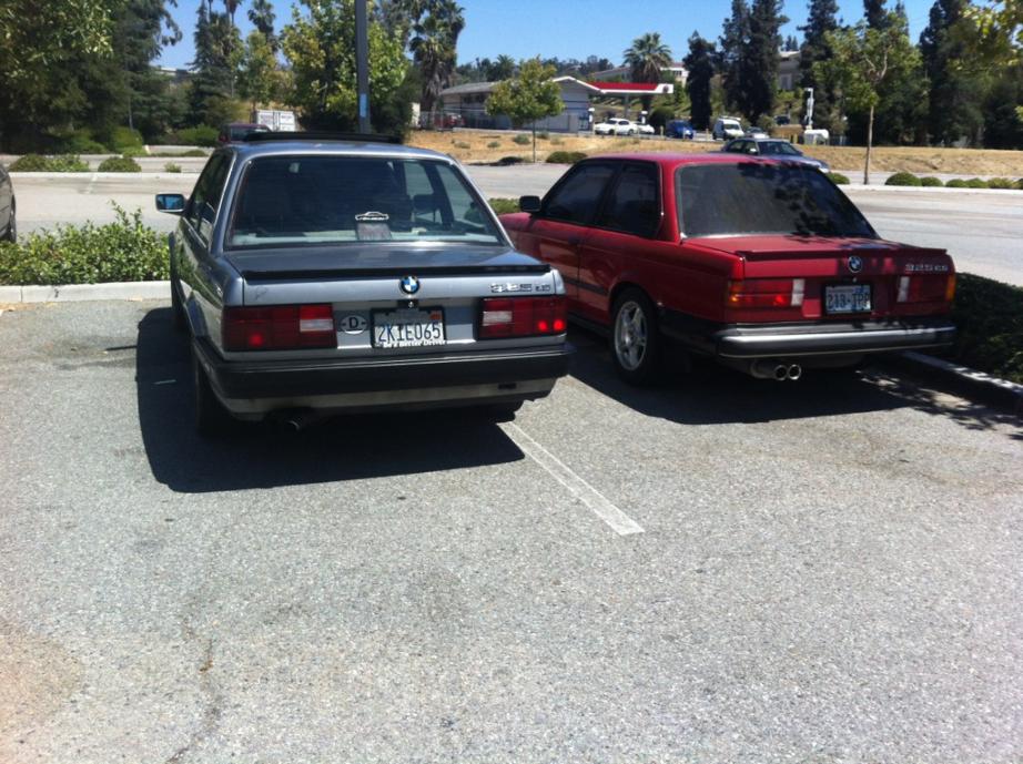 2 e30s at LA Fitness in redlands today, one is a late model alpine white 2 door lowered on black bottle caps and a vulva lip, the other one is a red ES on zender wheels, with euro smileys and Hartge side skirts88 325is Five SpeedLachssilberComment
