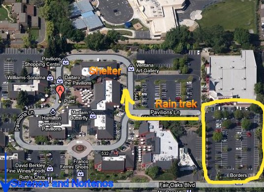 This is tomorrow. If it raining, we can move from Borders parking lot, into the back of the Pavillions parking lot, and hang out under eaves. There is also a Starbucks right there.