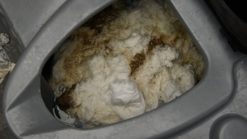 and now i'm staring at a grey toilet with tissue paper and chocolate starfish clogging it up.