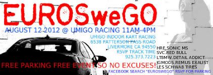 Time to strap yourself in! Its that time again! Time to have fun. Time for some sun. Time to let that inner kid out! EUROSweGO will be hosted by Hands Off at UMIGO RACING. Thats right go karting we go! All EUROs are welcomed!