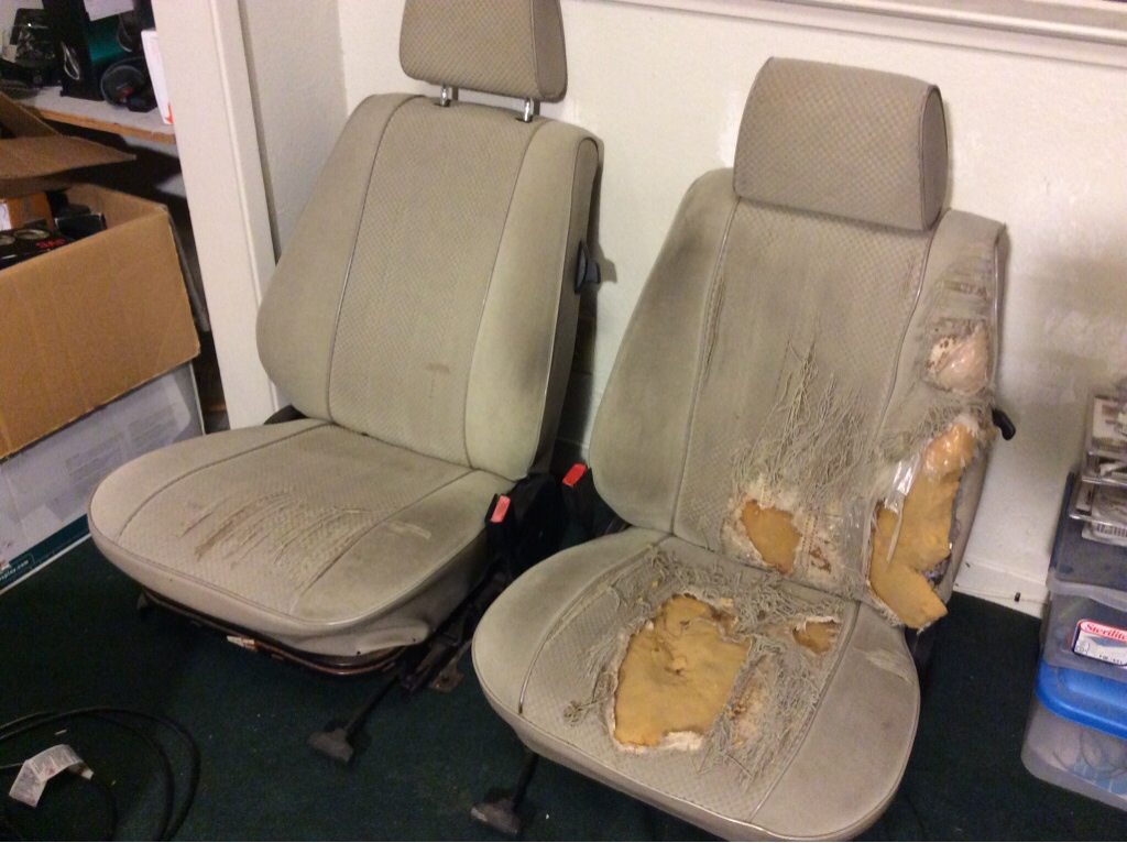 Cloth comfort seats from 85 318i. 75% there, needs gas shocks, common broken tab (have tab) and seat back bracket welded drivers left side, driver seat back cover missing tab, needs seat covers or upholstery. Cloth is pretty crispy from sun. Rear foam and springs are in good condition, front probably good, drivers side pretty rough. Seat belt receivers from different car, unknown, so you'll use your old ones. Rest of mechanics seem just fine, just dirty.
