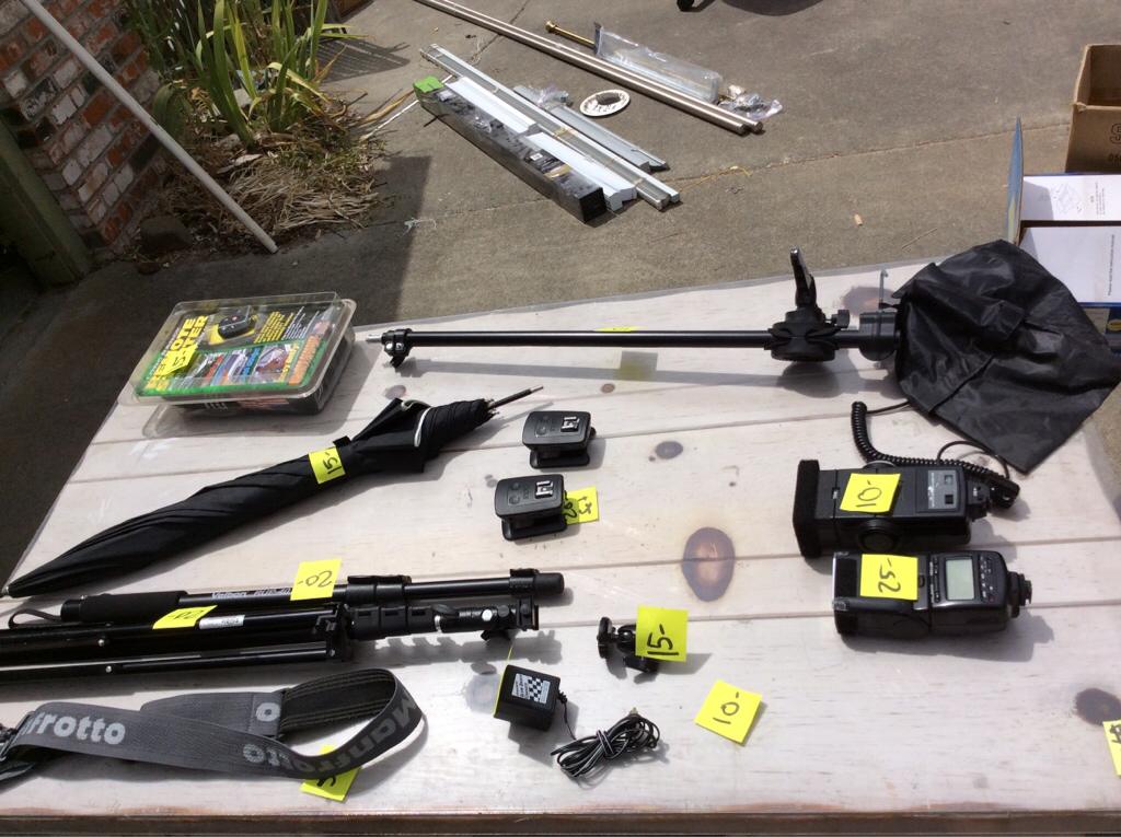 Nikon SB-26, 285 HV, wescott convertible umbrella, cactus V5 triggers, light stand, boom arm, umbrella swivel, mini ball head, monopod, slave flash trigger, PC and 1/8 mono cords.