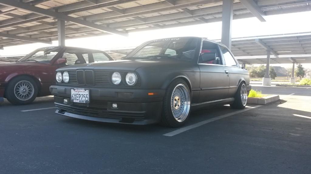E36 M3 5-lug suspension/brakes in the front, 318ti suspension/brakes in the rear, polyurethane, Z3M Coupe H&R Coilover kit IE camber plates, including wheels style 5's sprayed satin black on Yokohama S drives 85%