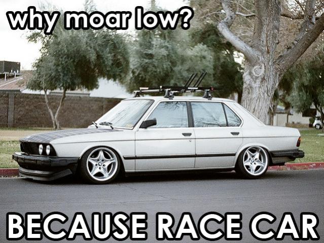 Low is just fine with stiff springs to keep the car from hitting the ground. Low and soft = suck.Comment