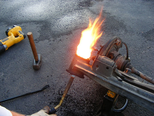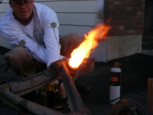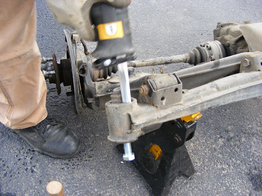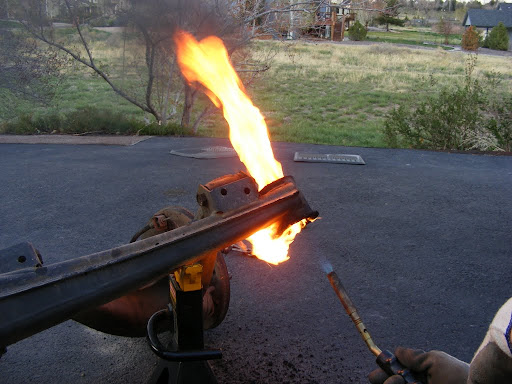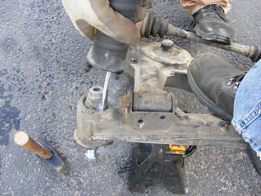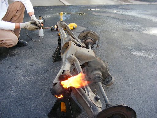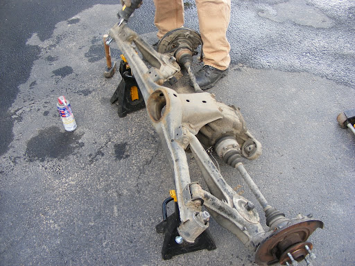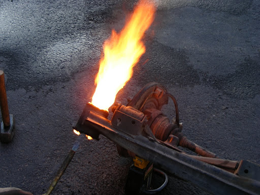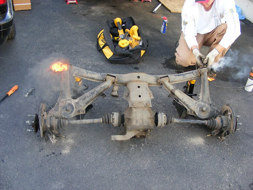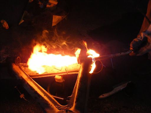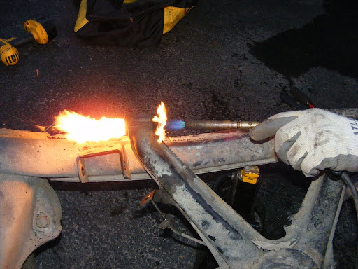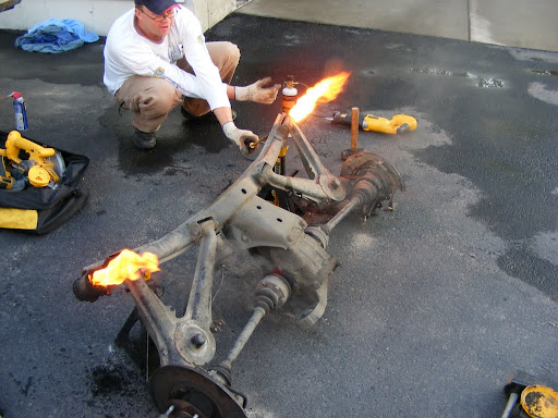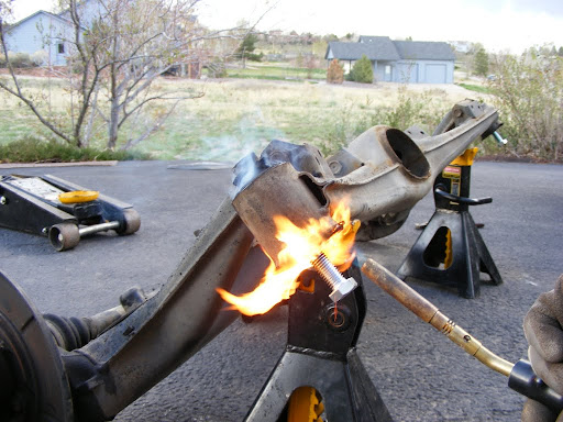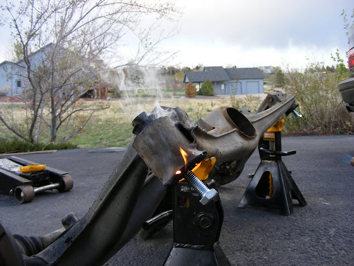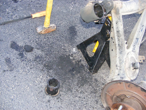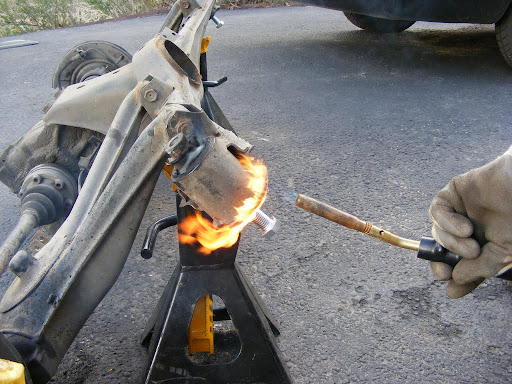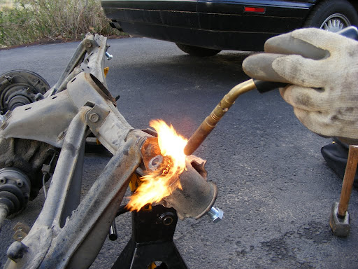 We also did this to the rear trailing arm bushings. This method has got to be much easier than pressing them out cold. The bushings oozed out like marshmallows, leaving no residue behind at all, leaving nothing but fresh machined steel.