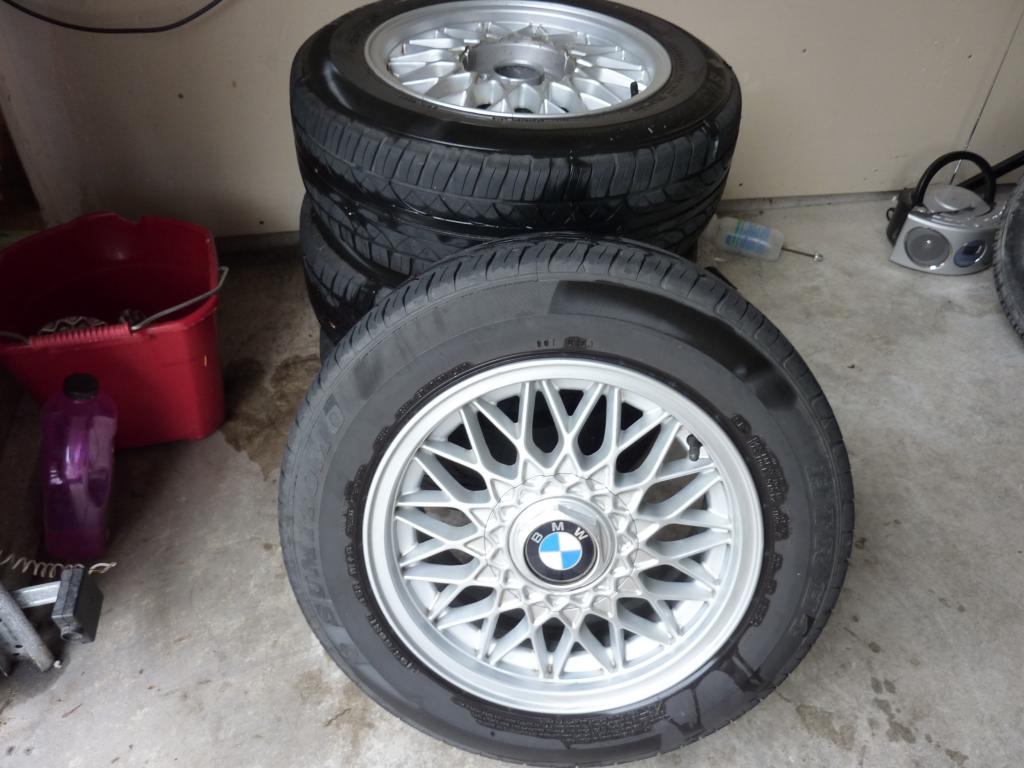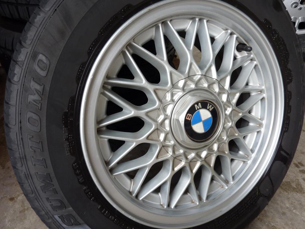 4 very nice 14" basketweaves with 195/60 Sumitomo HTR4. Enough tread to get you through the summer. Perfect centercaps included. 1 pristine bottlecap spare also available. Only 25lbs with the tire! $300