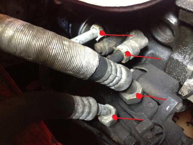 The top 2 are oil cooler lines.Almost pulled the m20 today, first time doing something like this.. and its all pretty straight forward, i didnt have the right wrench size.... so i could finish everythin was closed when i stumbled upon it... the last step before i loosen un do the mounts is the a/c anyone know what the size wrench i need so i dont go guess and check at the store in the am? they are marked in the picture."We praise or find fault, depending on which of the two provides more opportunity for our powers of judgement to shine."Comment