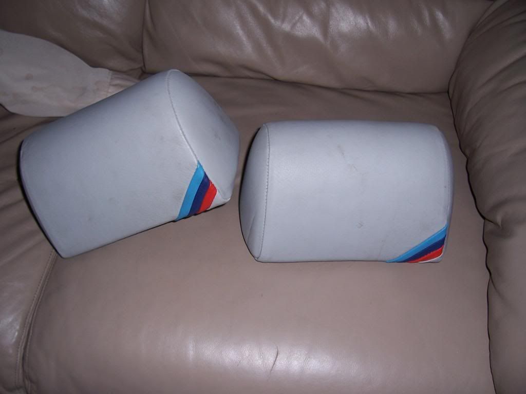 E36 rear head rests - $100 - RARE with the ///M Stripes. Damage shown in picture, a few small marks.
