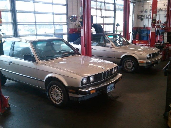Picked up a 1987 Bronzit 325e w/ 5 speed. Needs some work; clutch (have), ball joints,and a lower radiator hose. Have all these things minus ball joints so for $800 + $100 in parts and one day of work and I have a winner DD to deal with and can leave the convertible in the garage for winter. Picture related, it's the two matching cars in my shop.