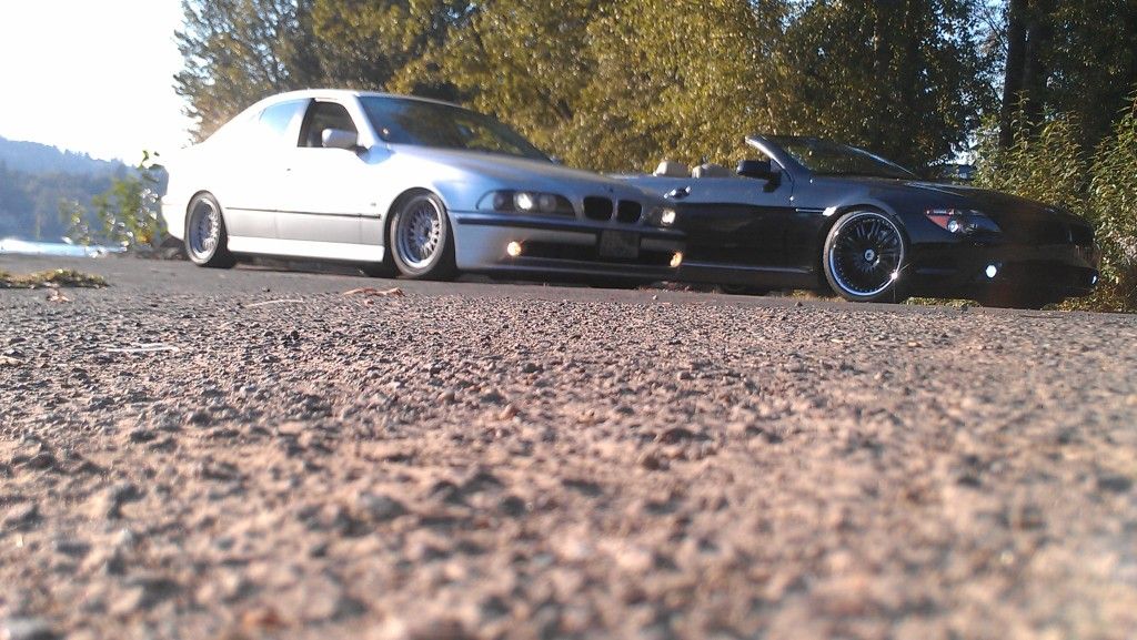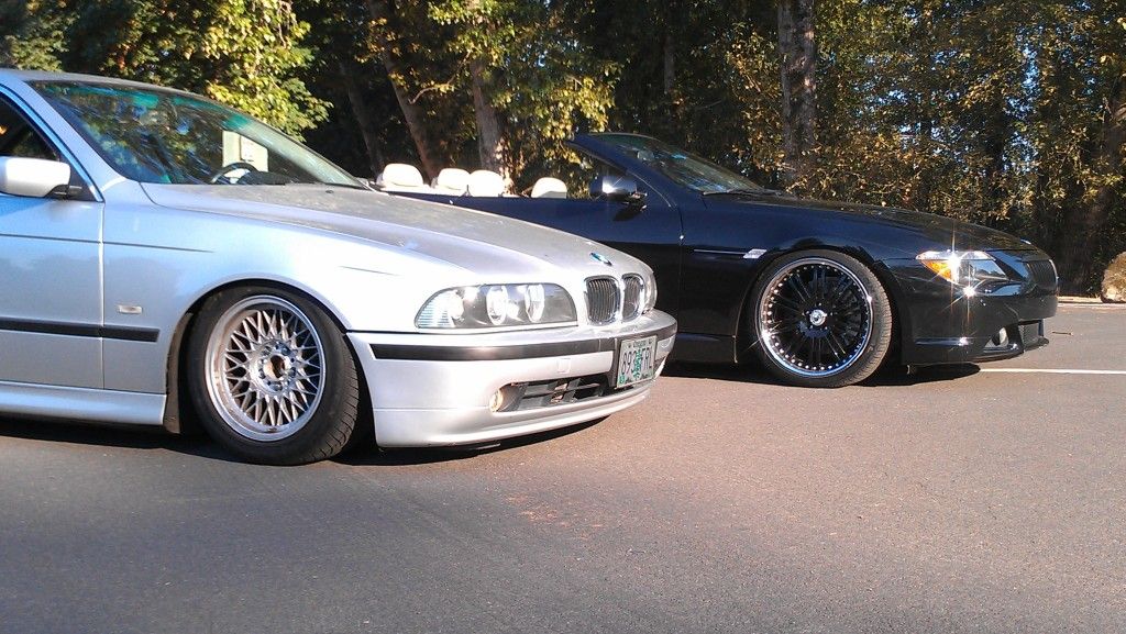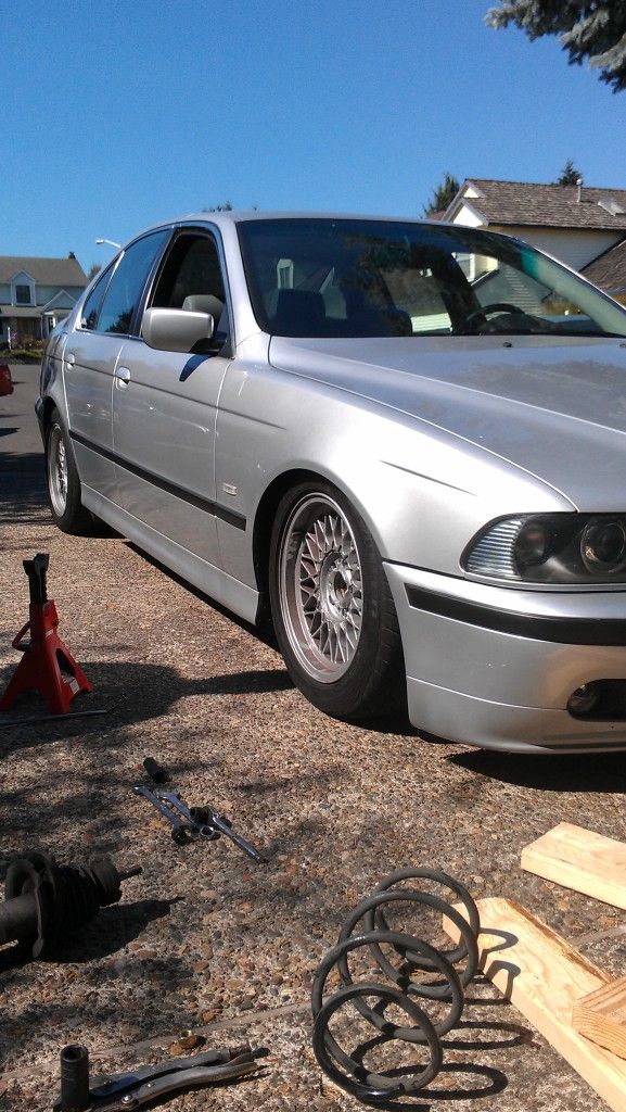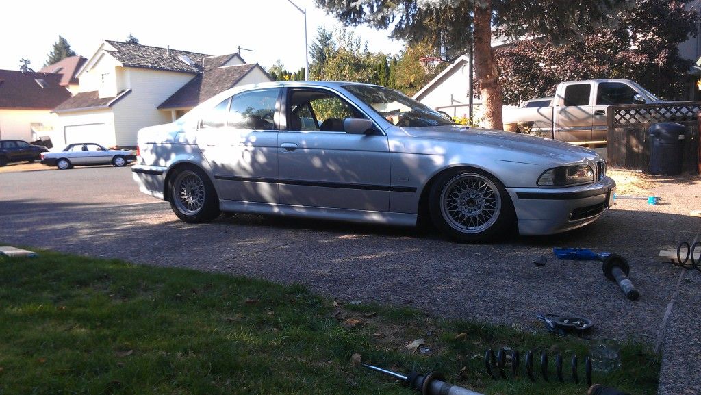 But here is my e39 after installing NNR cheapy coilovers...gonna order some shorter springs for the rear so i can drop it another inch or so. The e38 basket weaves are temporary/winter wheels until i go get my 17'' style 5's finished. Gotta get the lips polished and figure out if i want to paint or powdercoat the centers or leave them silver. Anyways heres the car...