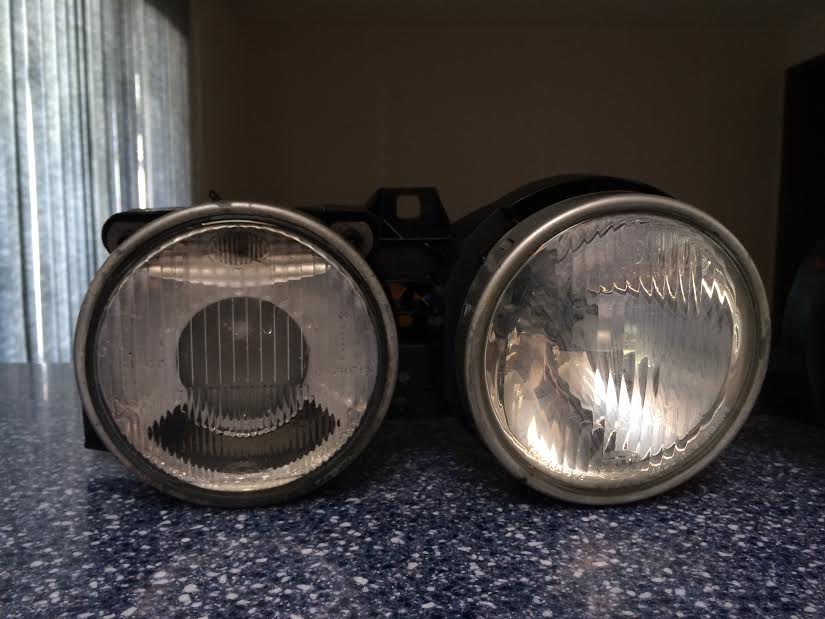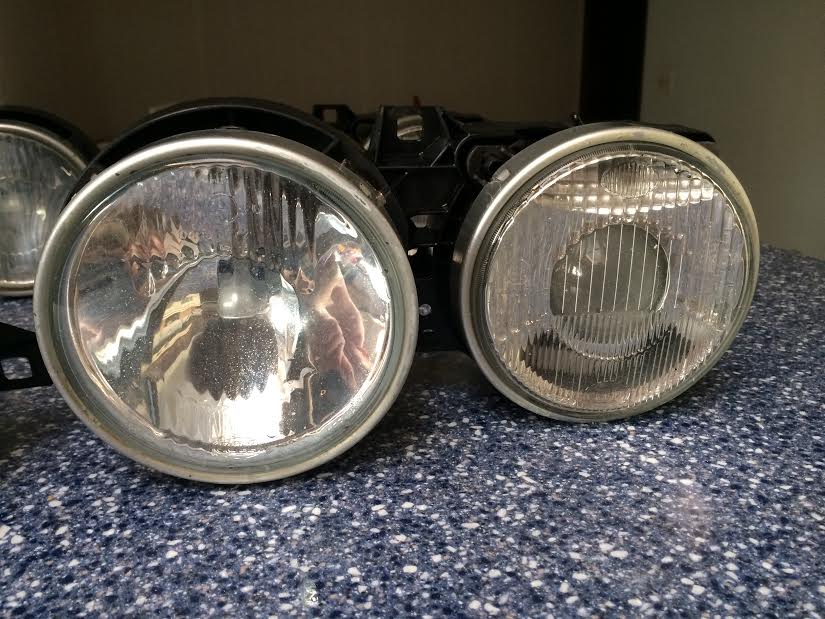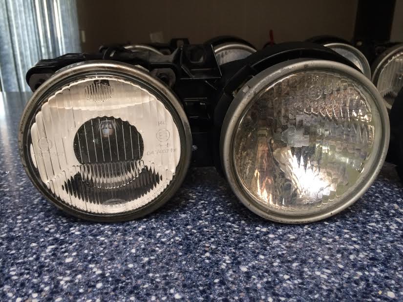 Set one is in good shape with no cracks. Some slight pitting on the glass, a few corroded adjusters and a couple broken clips that secure the light housing to the adjuster. One high beam has some discoloration.