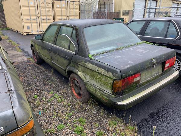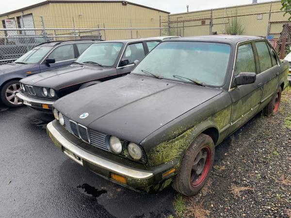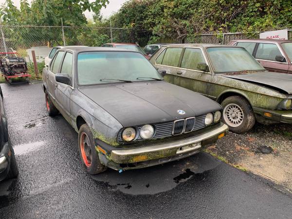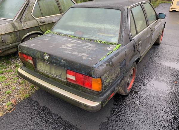 Parting this 09/1987 325 "Super ETA" sedan. Automatic transmission. Formerly Delphingrau-metalic, now rattle canned flat black, panels are mostly straight. Tan interior in okay shape. Off the road since 2009.