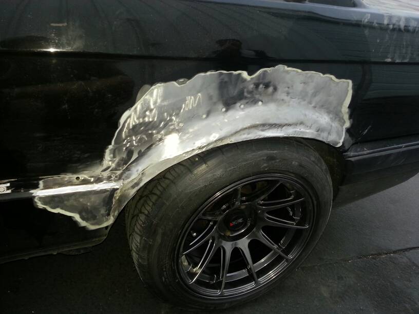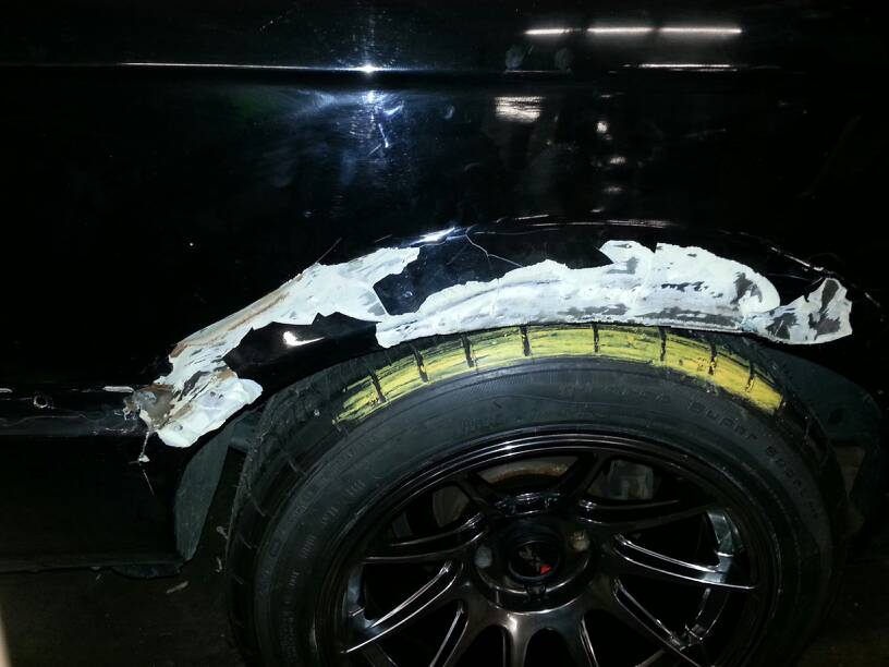 Looks like my two door will be in hibernation for awhile. I knew that there was bondo on the car but I was not expecting what I found. So I started sanding the quarter panel down and now it looks like ill be diving head first into body repair. Oh yeah and my wheels still rub